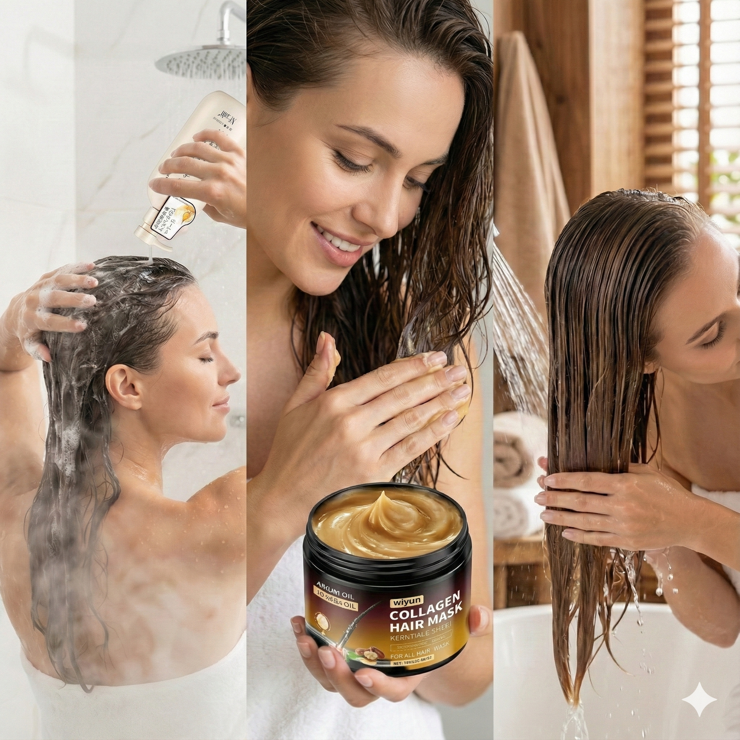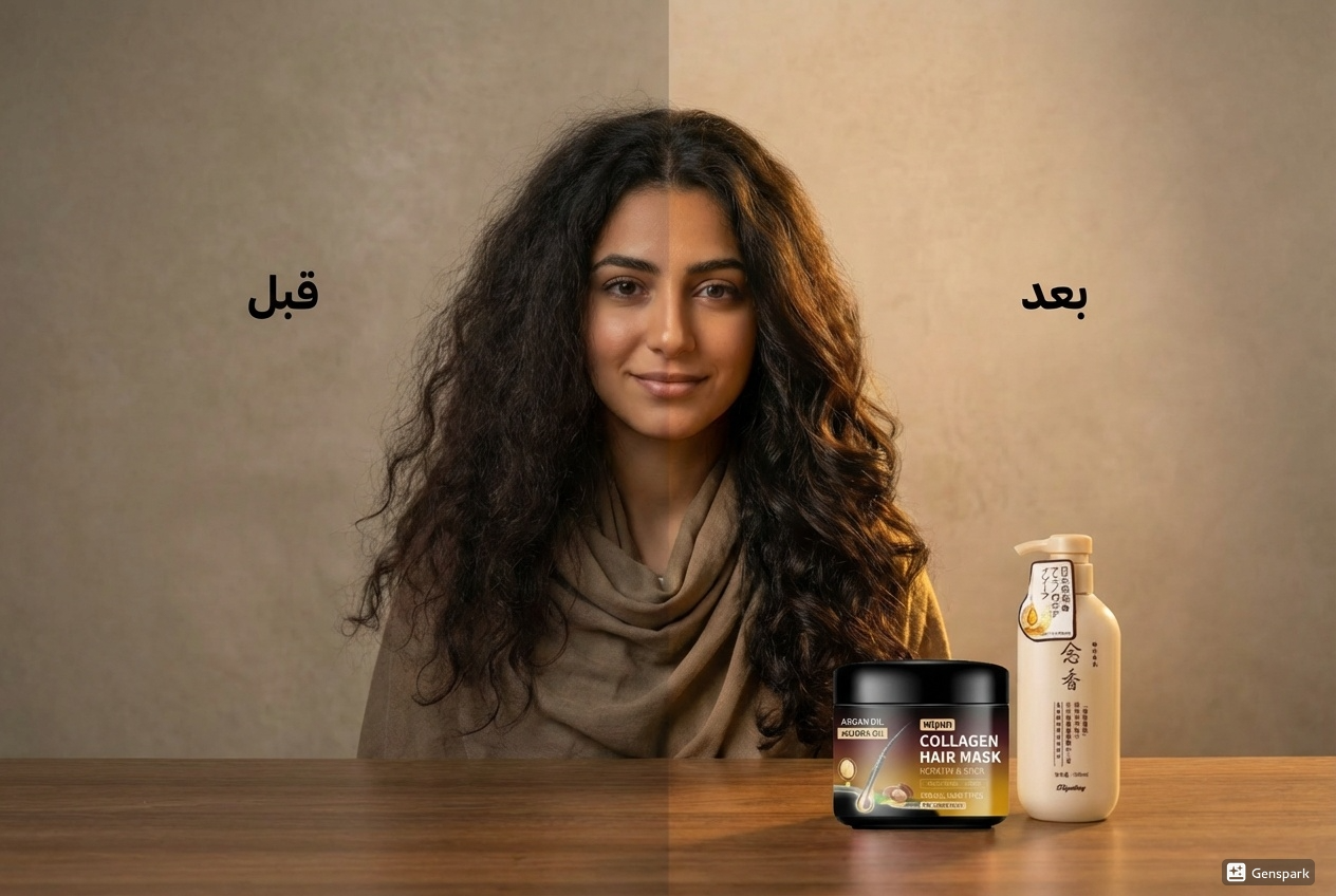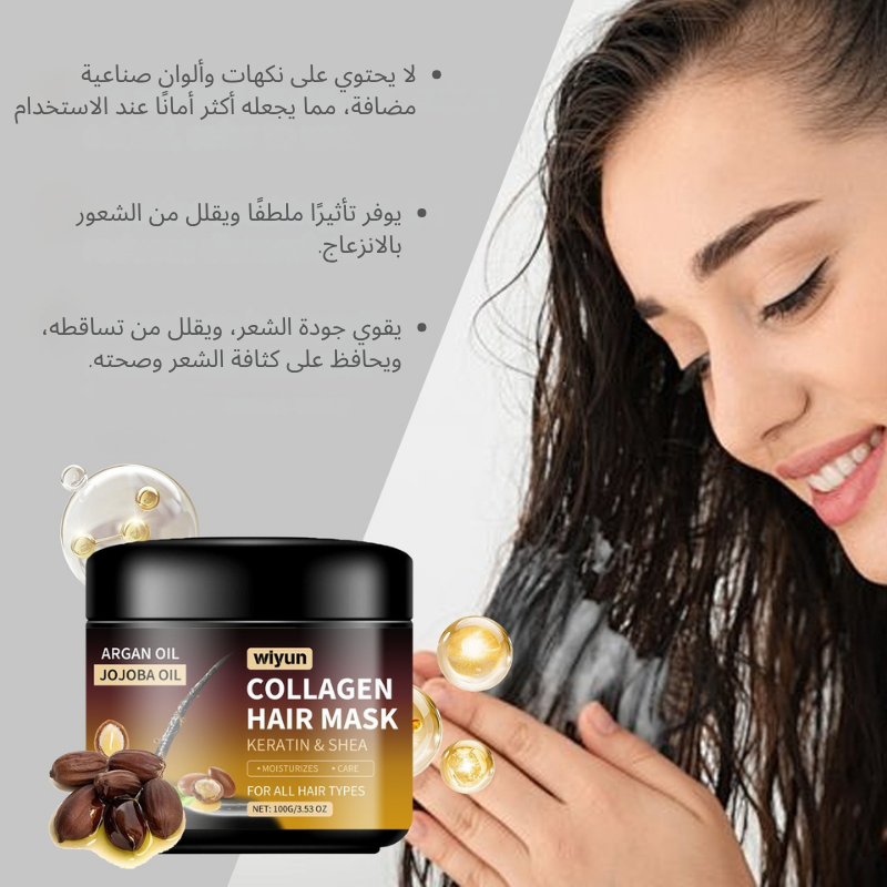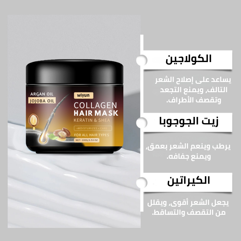 - ترميم الشعر الجاف والمتقصف:قناع الكولاجين يرطب الشعر بعمق ويعيد له صحته ومرونته.