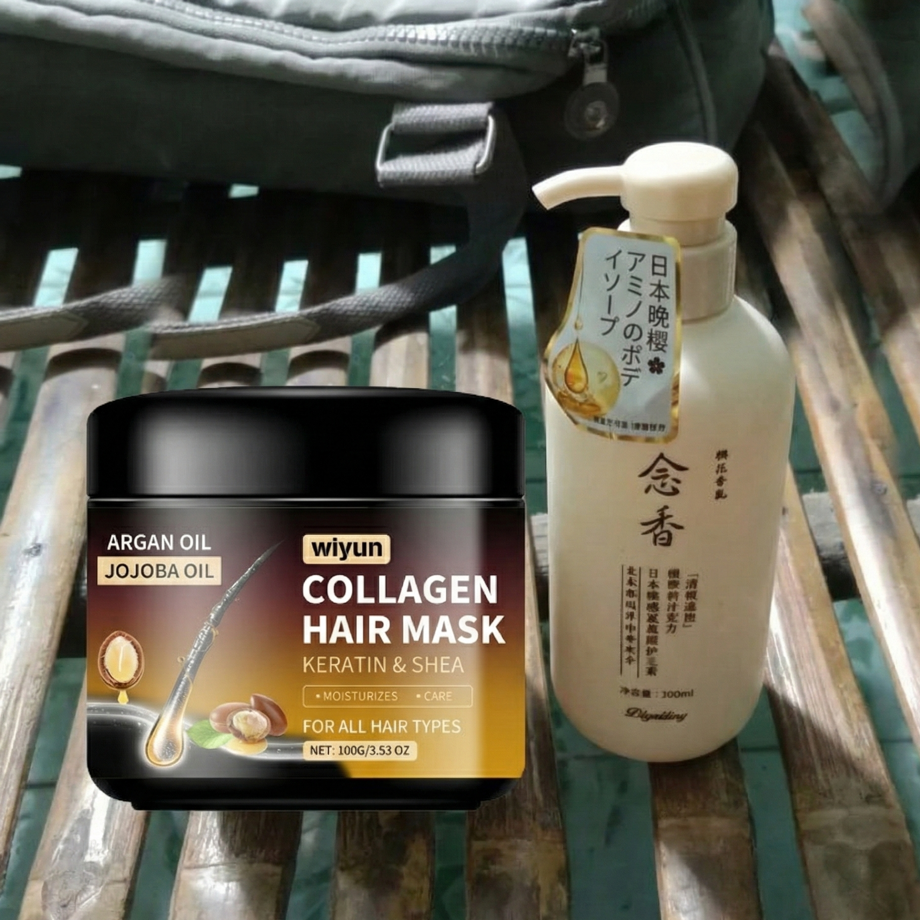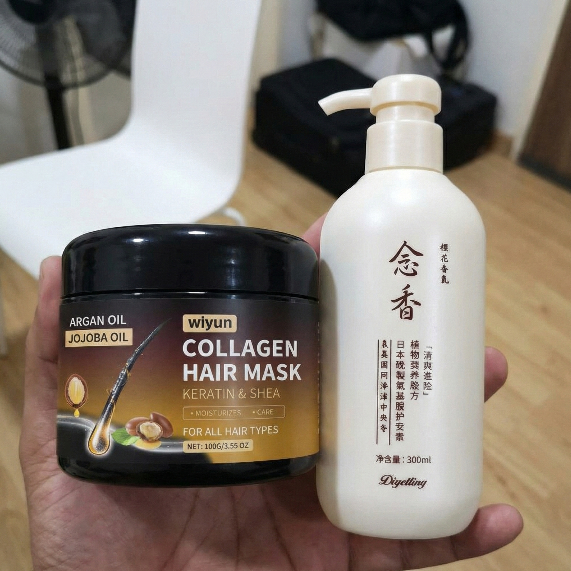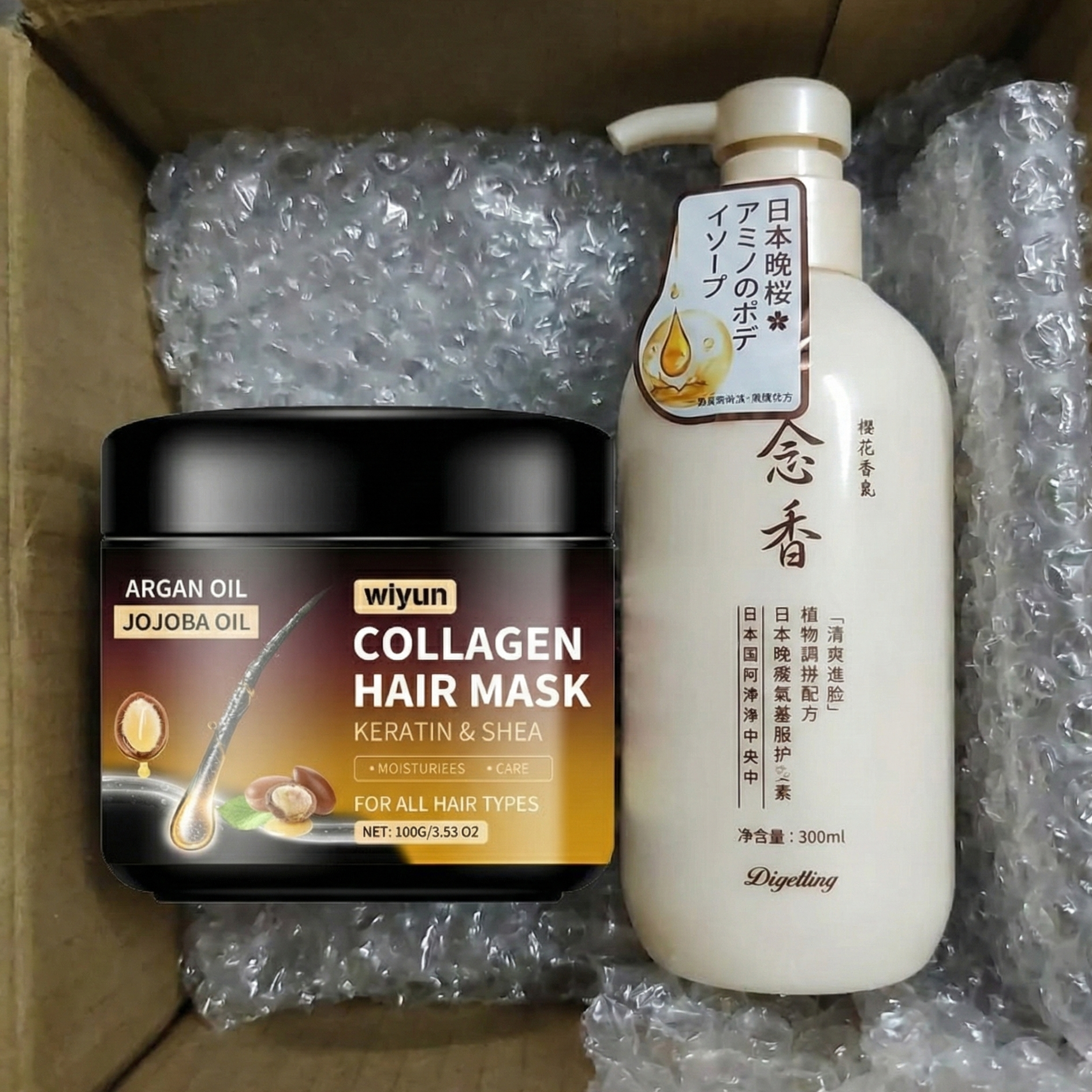 استمتع بشعر صحي ولامع مع قناع الشعر بالكولاجين وشامبو ساكورا الياباني – العناية المثالية لشعرك.