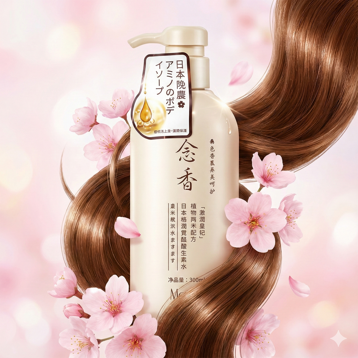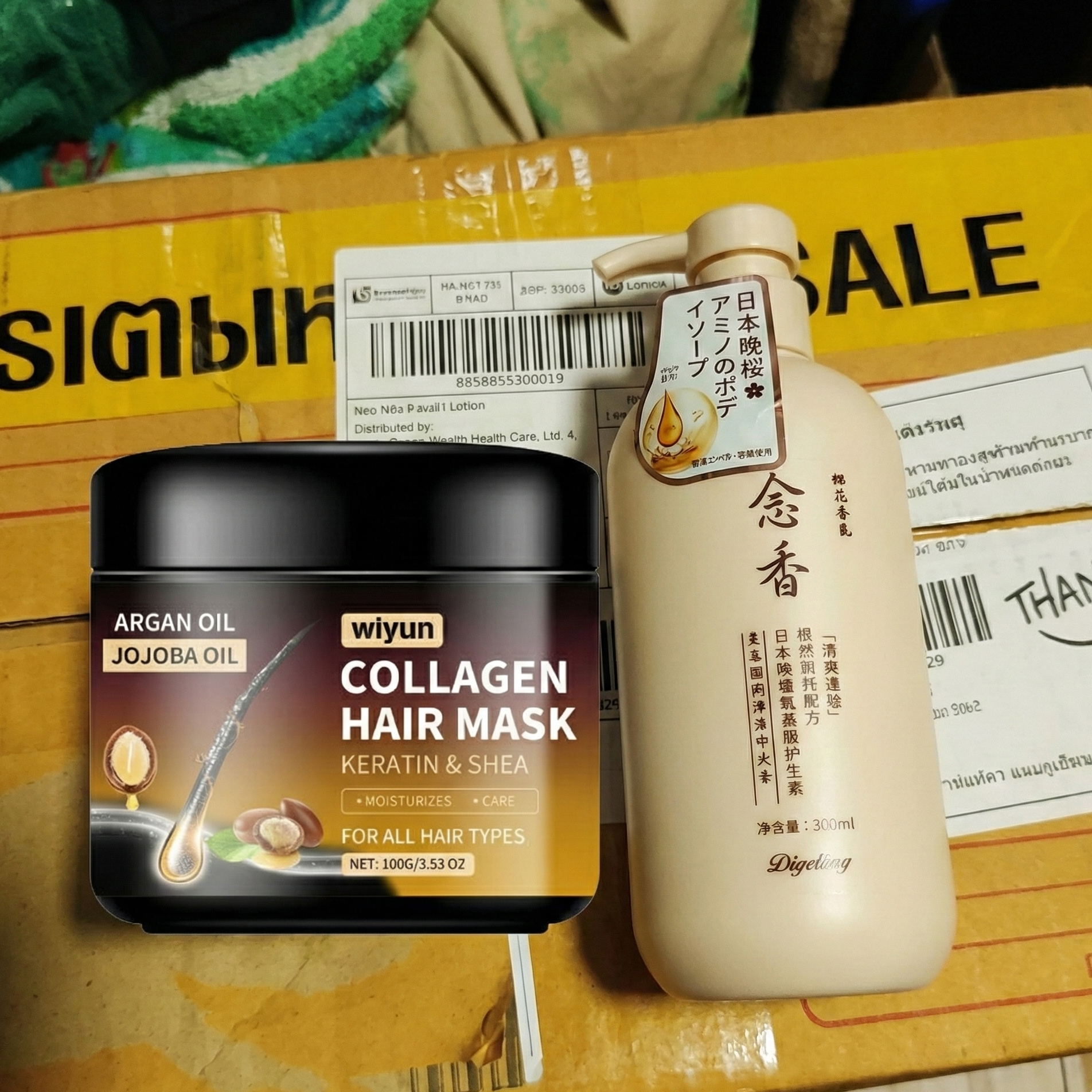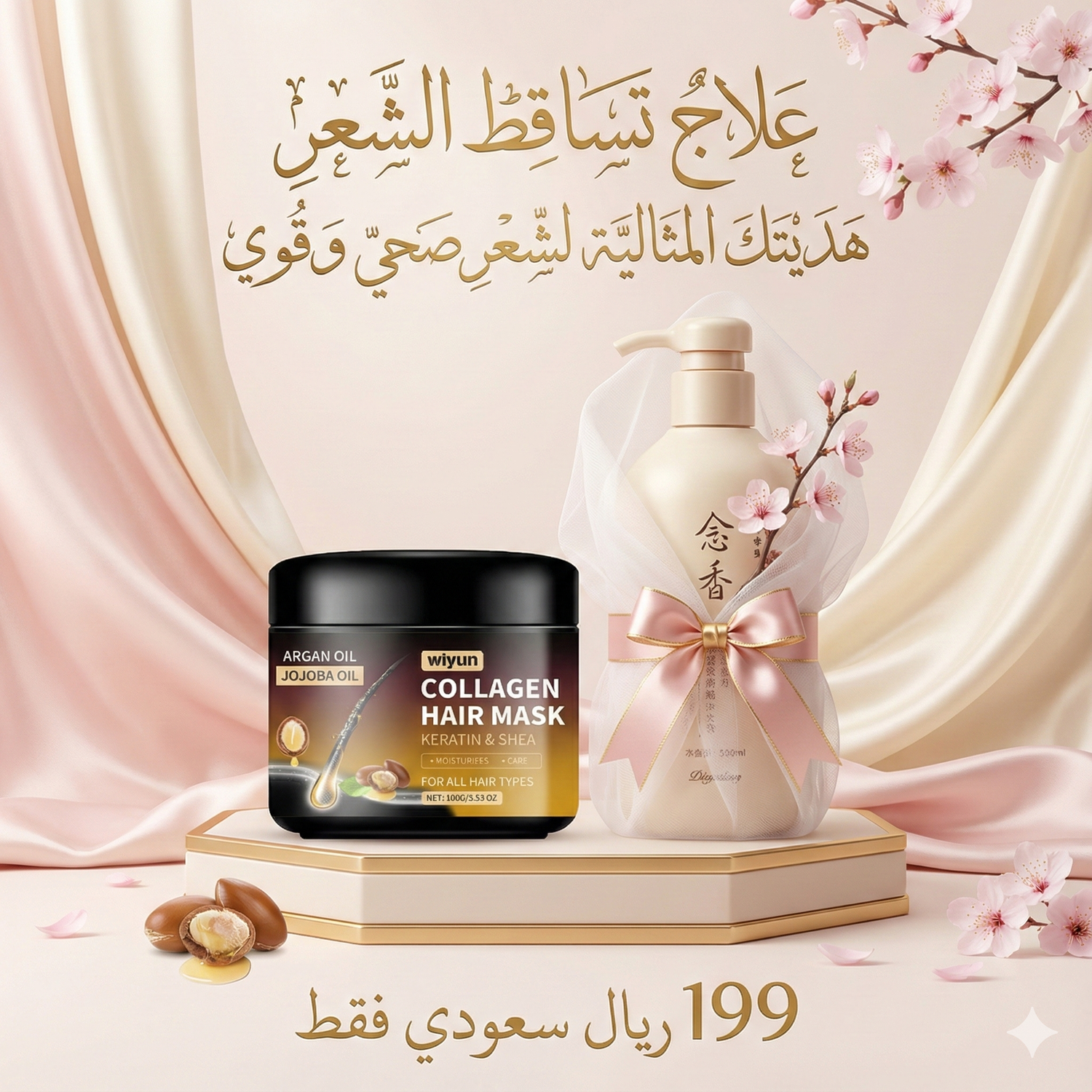 استمتع بشعر صحي ولامع مع قناع الشعر بالكولاجين وشامبو ساكورا الياباني – العناية المثالية لشعرك.